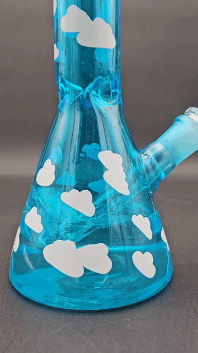 This is a classic 10" blue bong with cloud decals covering it