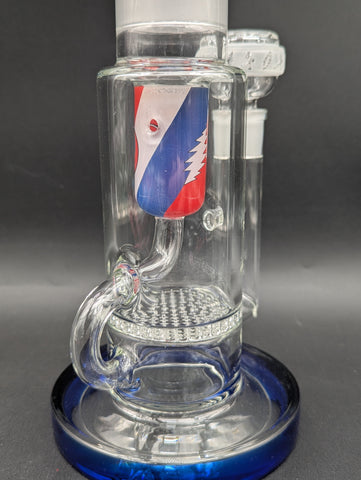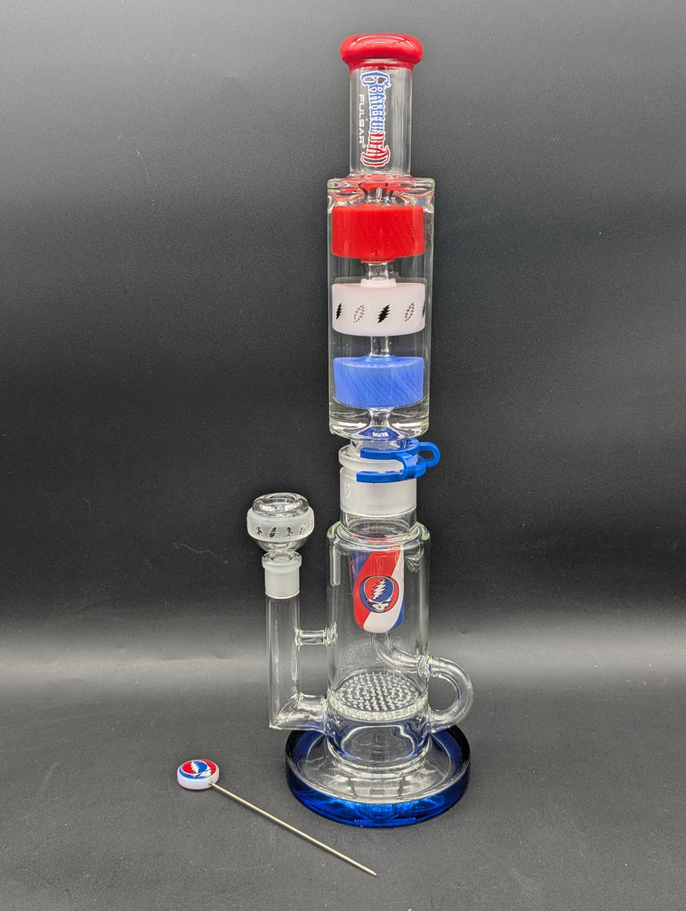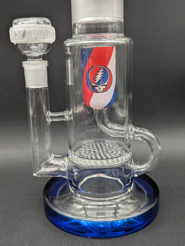 The Grateful Dead Cool It Down Stackable Glycerin Water Pipe has a segmented body, making it easy to take apart for cleaning. The base is crafted with a recycler style build and a honeycomb percolator; the removeable neck piece is filled with freezeable glycerin with a triple bullet hole diffuser for ultra cool hits. The pipe is decorated with a Grateful Dead Steal Your Face design, and the kit includes a matching metal poker tool. Measures 16.5 inches (41.9cm) tall. Includes a matching 14mm male bubble style herb slide with a frosted glass design.