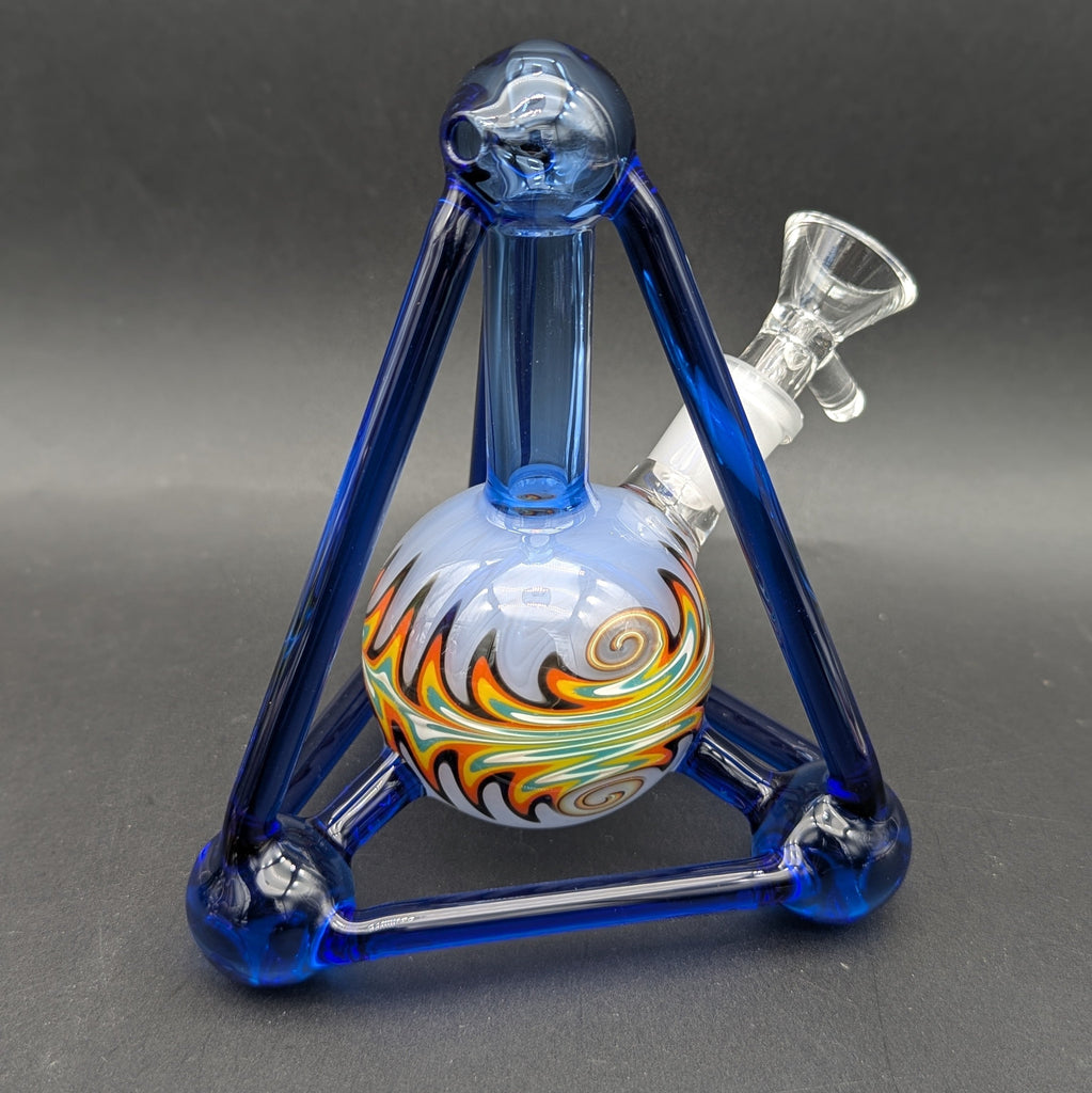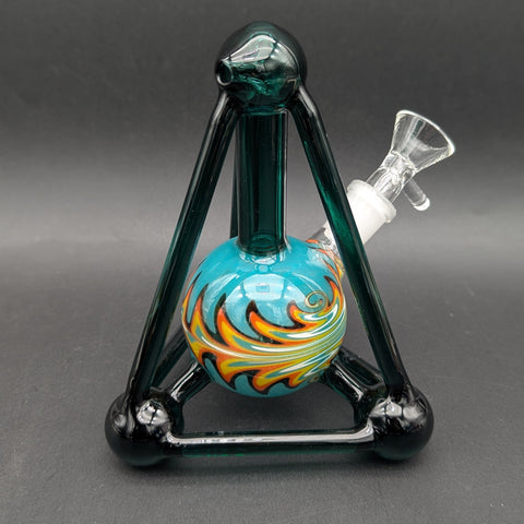 This is a mini 6" Tall beaker bong with a built in tetrahedron cage around it to provide stability on any surface. This bong can not be tipped over! Built in downstem