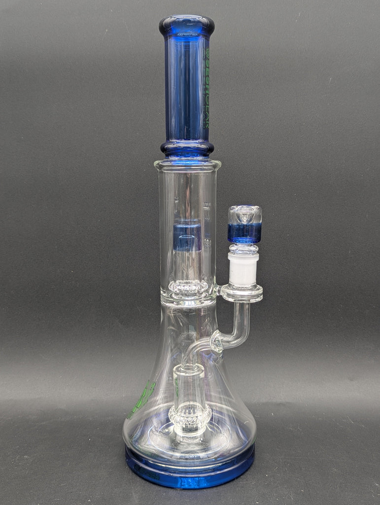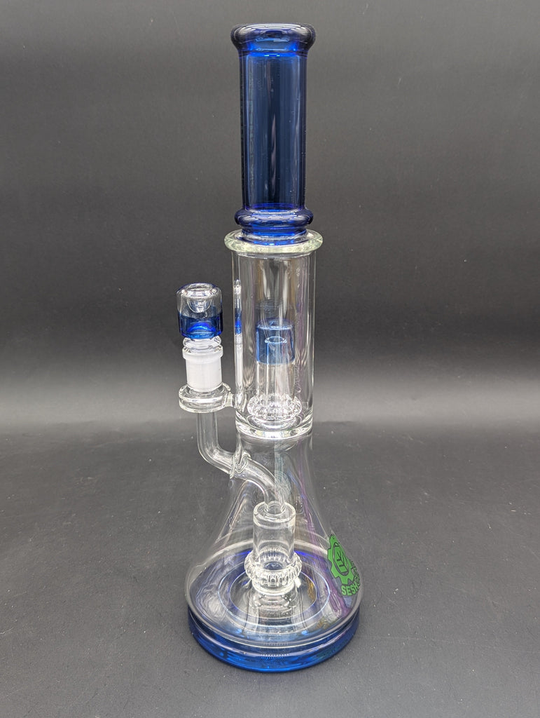 The Double Showerhead Perc Glass Water Pipe from Pulsar is crafted with two percolators: a showerhead perc in the base and a UFO percolator in the neck. The quality borosilicate glass water pipe has a wide, stable base and a SeshGear logo on the neck. Measures 13 inches (33cm) tall. Includes a matching 14mm male barrel style herb slide.