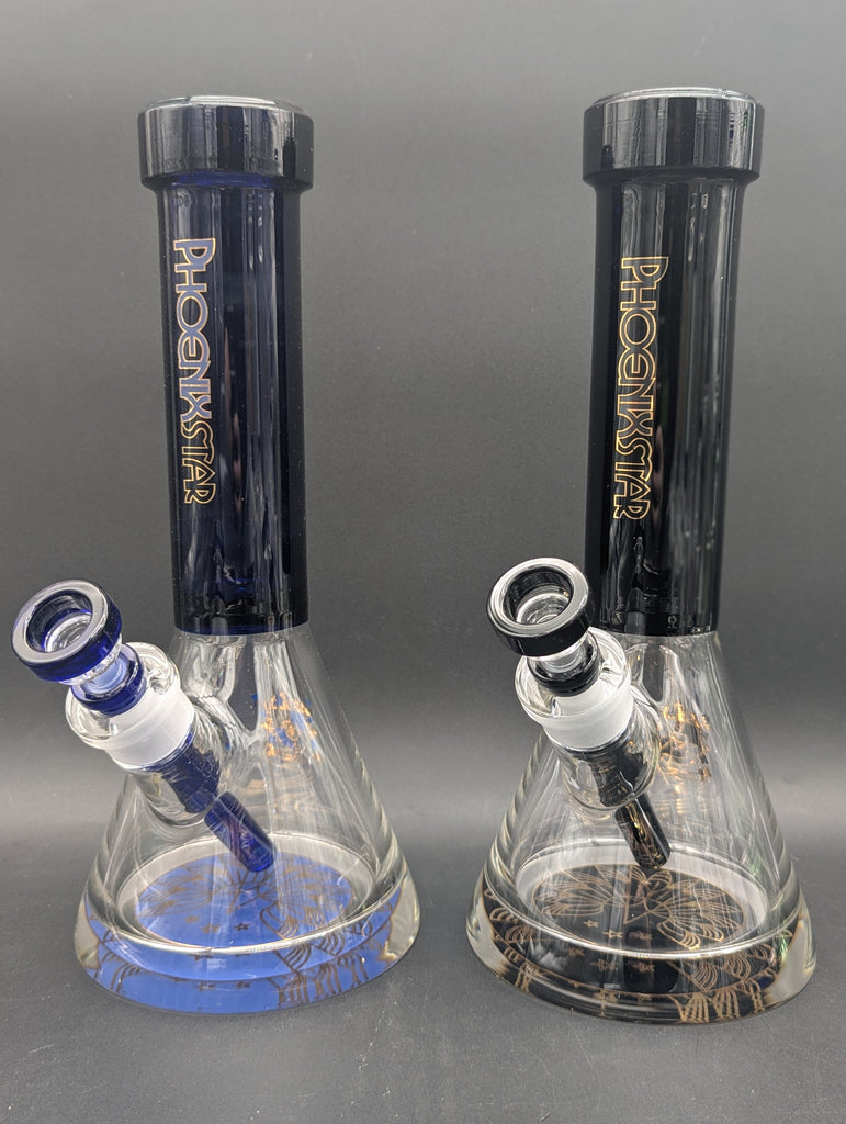 Phoenix Glass beaker bong with 9mm thick sidewalls and an extra thick base. Color accents on base and neck, downstem and bowl.