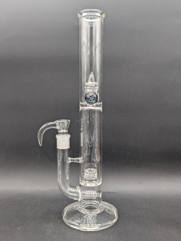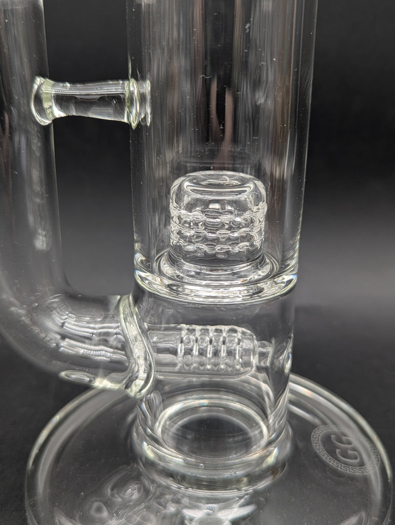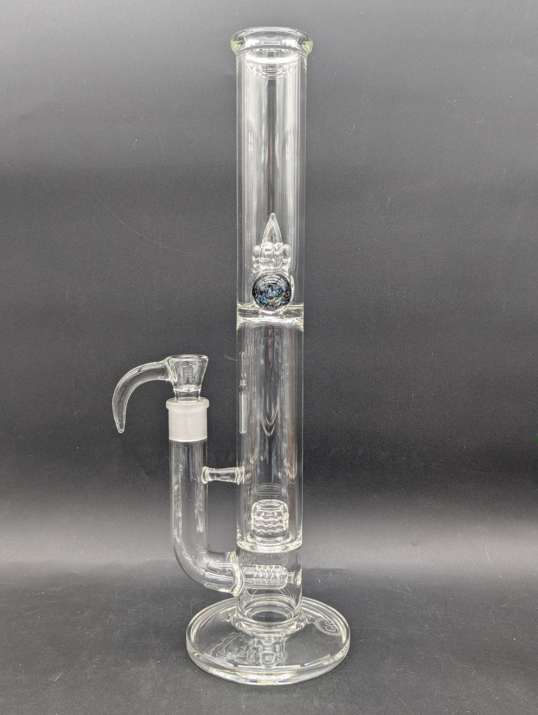 This high-performance water pipe by Greek Glass artist Biao Tang features a gridded inline stem leading into a 360° grid cap percolator for smooth, high-diffusion function. A triple gridded splash guard adds dry protection, while a fixed dichro marble enhances the piece visually.
