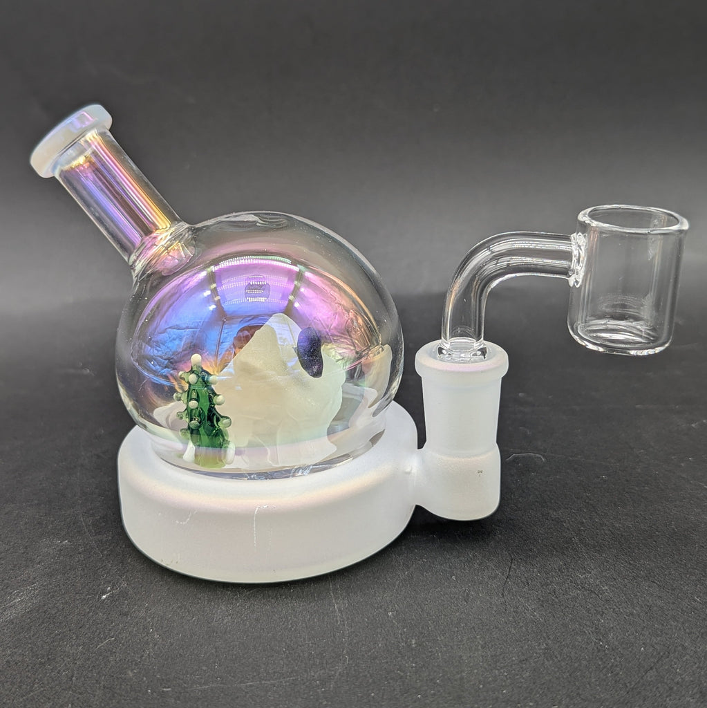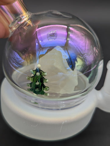 The Christmas House Globe Glass Water Pipe stands 3.75 inches (9.5cm) tall and is made from quality borosilicate glass. The pipe is crafted in the shape of a snow globe with a novelty Christmas house percolator, a frosted glass base, and an angled mouthpiece. Includes a 14mm male herb slide with a handle.