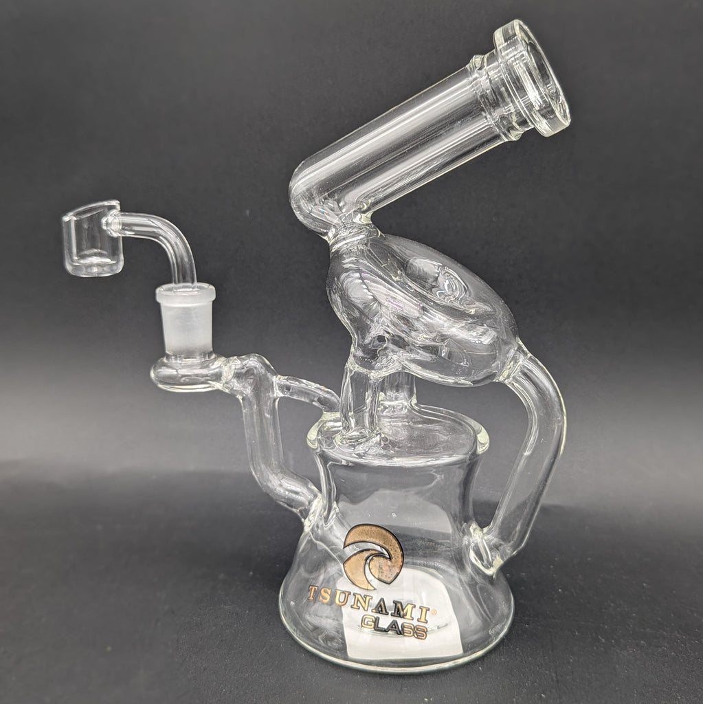 This 8" Tsunami dab rig is a compact glass concentrate rig designed for smooth airflow and continuous water filtration. Featuring a sprinkler-style percolator combined with a recycler system, this setup cycles water through the chambers to cool vapor while maintaining strong flavor. The angled neck and compact design make it easy to handle for everyday use, while the durable borosilicate glass construction ensures long-lasting performance. This mini recycler rig comes ready to use with a 14mm male quartz banger.
