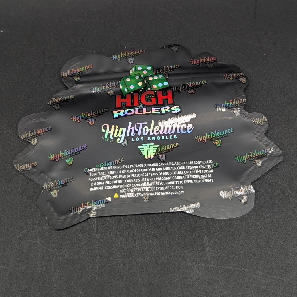 This holographic dice-themed mylar bag features a bold “High Rollers” style front design with a slot machine and a matching branded pattern on the back. Both sides are printed on thick, durable mylar with reflective rainbow accents for maximum shine. Great for packaging small accessories, crafts, keepsakes, or novelty items.
