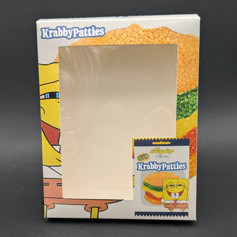 Bring playful vibes to your packaging lineup with these Cartoon Burger Gummies–Style mylar bag, complete with a matching display box. These bags feature a bright, smiling cartoon sponge character and a colorful gummy-burger graphic, perfect for shops wanting fun, eye-catching packaging.