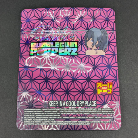 Bring bold color and playful artwork to your packaging line with these Bubblegum Popperz Holographic mylar bags. Each bag features an anime-inspired character illustration on a full holo geometric background for maximum shelf appeal. The thick mylar construction keeps contents secure, while the heat-sealable top and resealable zipper provide reliable, reusable closure.