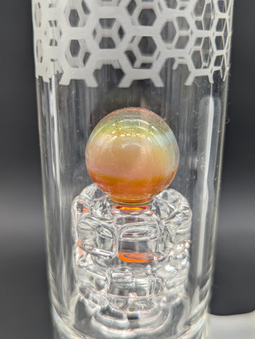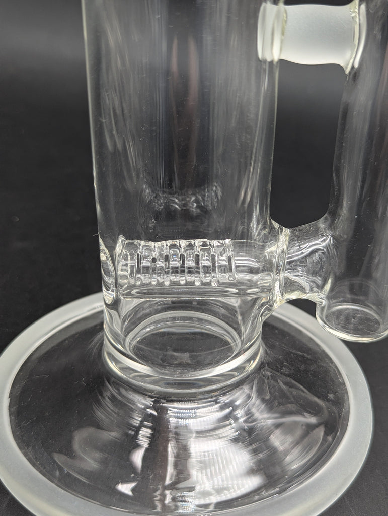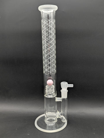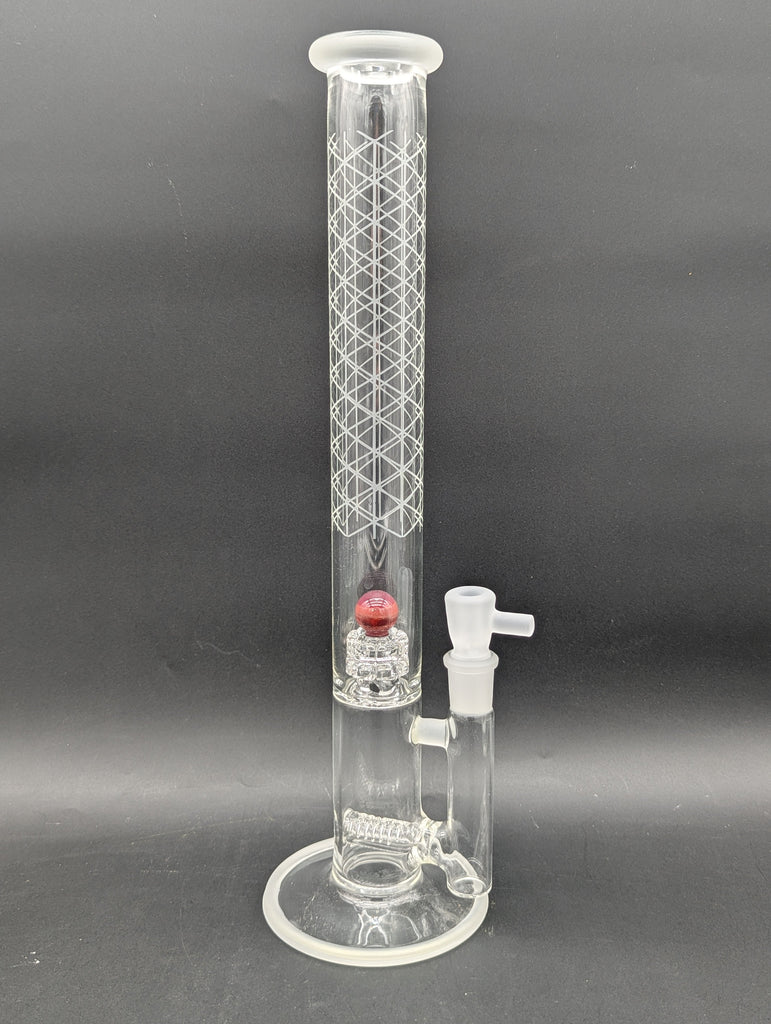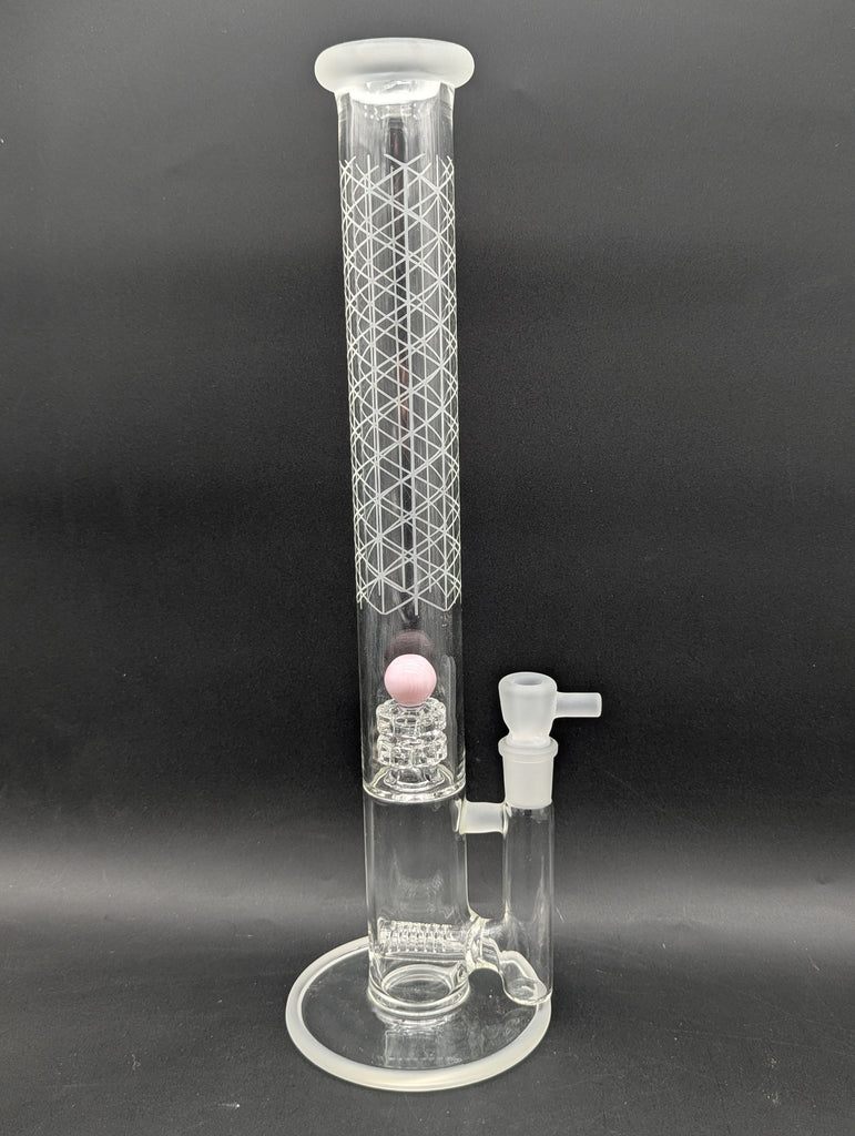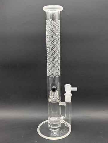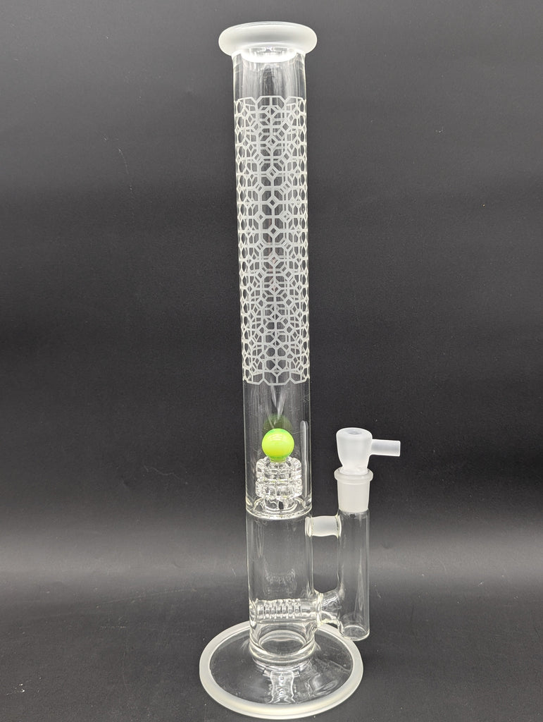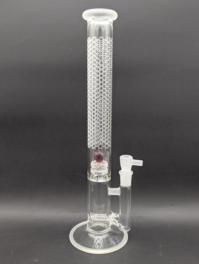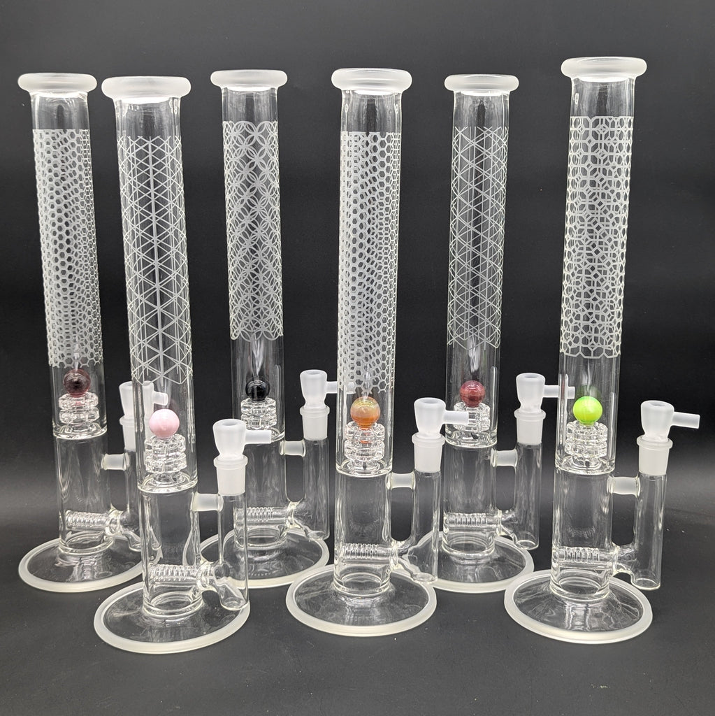 Airflow begins with a clean inline perc at the base and rises into a precision-cut showerhead, delivering strong chug with a smooth, balanced pull. The tall straight-tube design provides powerful stacking without harshness, and the wide frosted base keeps the piece stable despite its height. Each tube includes a matching 18mm sandblasted triple-pinch slide, crafted to match the frosted aesthetic from top to bottom.