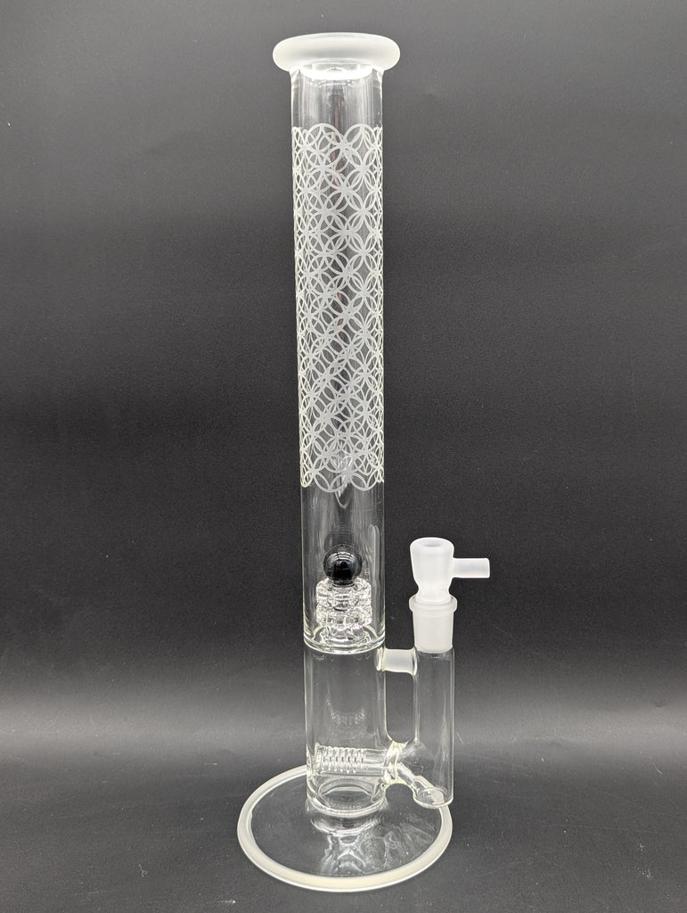 These 16-inch straight tubes from Gnob Glass highlight the artist’s signature balance of crisp diffusion and intricate sandblasted design work. Each piece starts with thick 44mm tubing that’s been hand-etched in Gnob’s recognizable geometric patterns, leaving the tube frosted while the perc chambers remain crystal clear for contrast. A colored signature Gnob orb sits above the upper perc—his trademark accent that marks every piece as individually made.