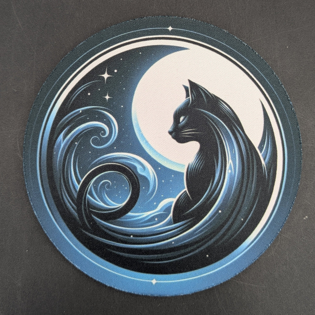Midnight glass Dab Pad featuring a cat in the stars, surrounded in a swirl of smoke. Unlabeled for a clean background under your rig! These are LIMITED EDITION Dab Mats and will not be made again!