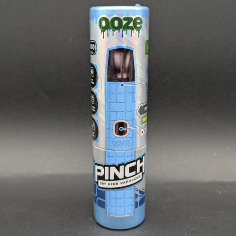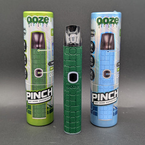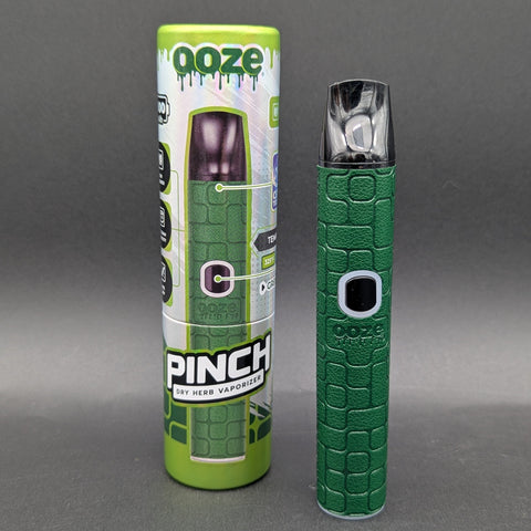 The Ooze Pinch is a slim, Ooze pen-shaped dry herb vaporizer. It has a simple interface with a single button, three temperature levels, and a C-Core ceramic chamber that holds 0.3g of flower. It has a leather-like luxe grip that adds a nice, grippy touch.