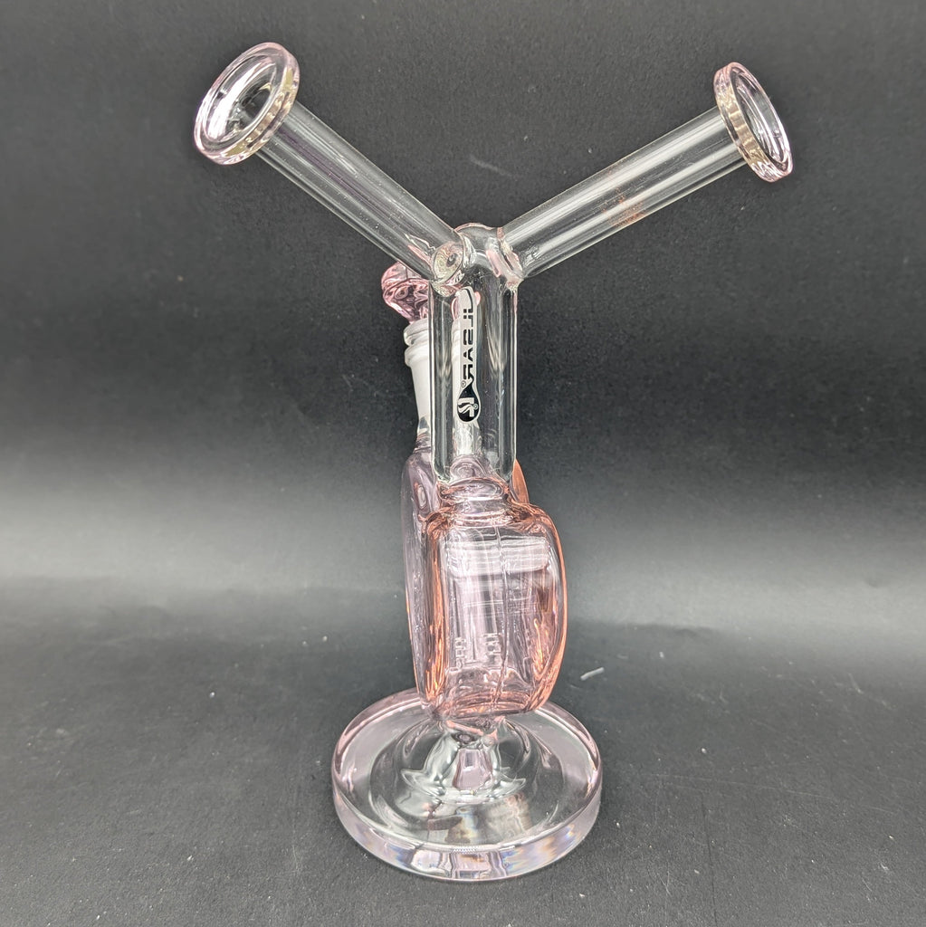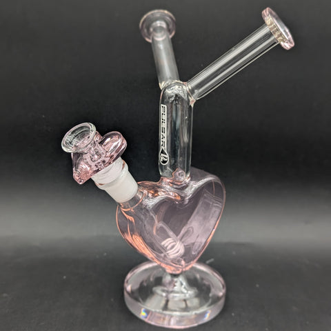 The Pulsar Double Kiss Heart Glass Water Pipe has a heart-shaped base with a lovely pink hue and a matching pink heart grip on the herb slide. The quality borosilicate glass water pipe has a wide, stable base and a branching mouthpiece with two openings for a pair of lover to share a hit. Includes a slitted downstem diffuser and 14mm male herb slide. Measures 11 inches (27.9cm) tall.