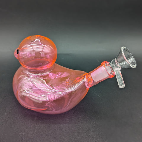The SeshGear Floating Ducky Glass Water Pipe measures 5.5 inches (14cm) tall and is made of quality borosilicate glass. The pipe has a fixed downstem and is shaped like a friendly, floating rubber ducky. Includes a 14mm male funnel style herb slide with a rod handle.