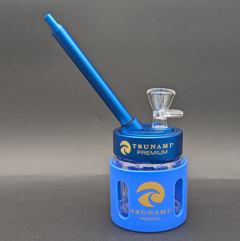 This Tsunami mini bubbler pipe is a compact water-filtered dry herb pipe designed for smooth hits in a portable, travel-friendly setup. Featuring a durable glass chamber protected by an aluminum outer shell, this mini bubbler delivers reliable filtration while maintaining a lightweight and sturdy design. The built-in water filtration system cools each pull for smoother, more flavorful sessions, while the silicone sleeve adds grip and durability for everyday use.