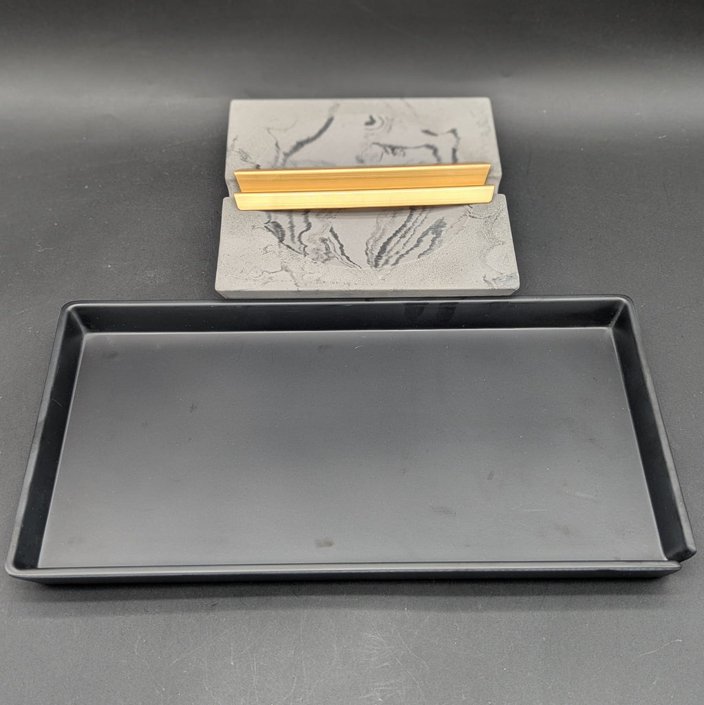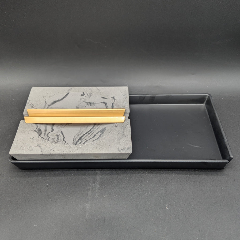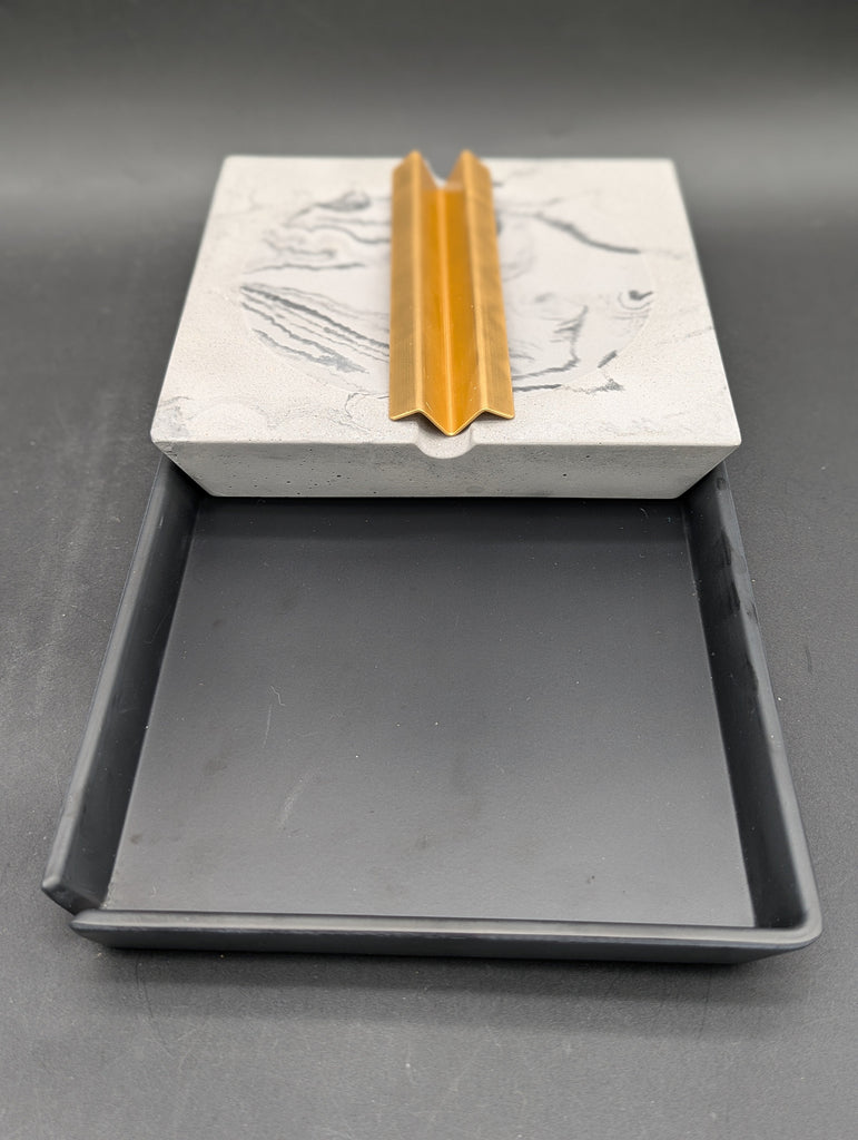 The Roseland Set is a tribute to timeless style and effortless function, combining elegant design with practical use. Featuring a hand-poured, marbled concrete ashtray, this set rests atop a sleek melamine rolling tray, creating a sophisticated and versatile setup. The brushed brass rolling tool adds a unique touch, perfect for separating your greens or securing your favorite papers in place. Crafted for the discerning, the Roseland Set is ideal for ashing and stashing your essentials, whether entertaining guests or enjoying a quiet moment in your own space.