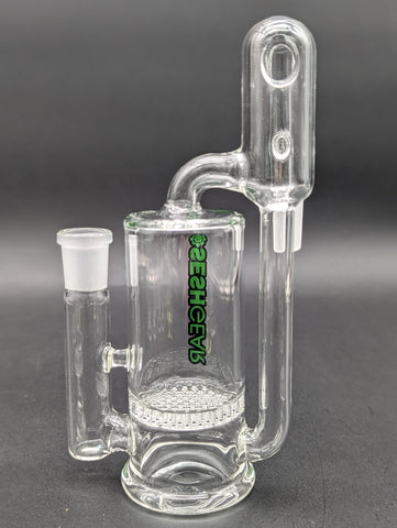 This SeshGear Recycler Ash Catcher functions to cool air, prevent splashback, and keep your customer's water pipes cleaner. The ash catcher features a honeycomb percolator and cycles water to prevent build-up and cool smoke. Works with most 14mm female water pipes with a 90 degree joint angle.